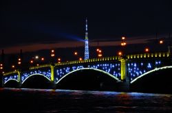 Художественная подсветка с проблесковыми светильниками серии Quadro производства Pfannenberg на Троицком мосту в Санкт-Петербурге